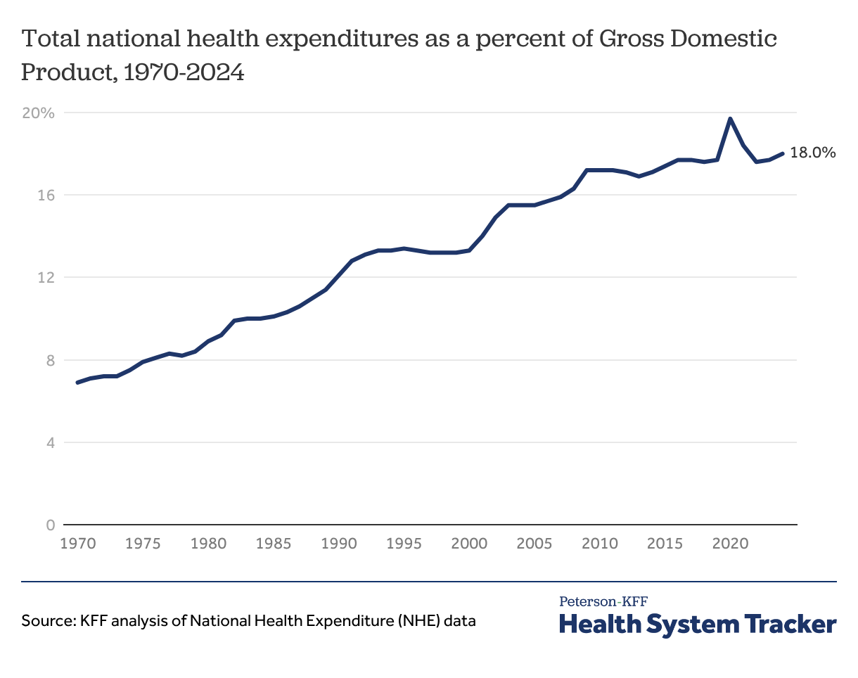 Health spending as a percent of gross domestic product (GDP) reached 18.0% in 2024, an uptick from 17.7% in 2023 as health spending grew faster than GDP.