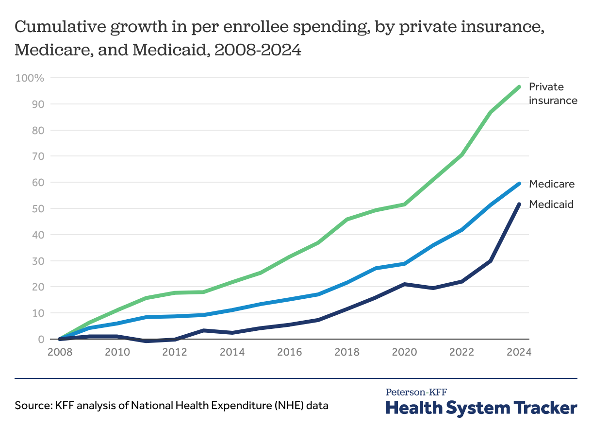 Per enrollee spending by private insurers grew by 96.5% from 2008 to 2024 — much faster than both Medicare and Medicaid spending growth per enrollee (59.5% and 51.6%, respectively). In general, private insurance pays higher prices for healthcare than Medicare and Medicaid.