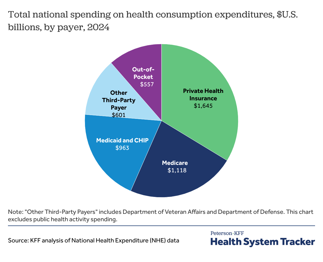 While private health insurance covers over half of the U.S. population (55%), it accounted for about a third of national spending (34%) on health consumption expenditures in 2024, excluding public health activity. Public health insurance programs managed in part by CMS, including Medicare, Medicaid, and the Children’s Health Insurance Program (CHIP), accounted for 43% of all health consumption spending. These programs often cover populations with higher healthcare utilization, including older adults, adults with disabilities, and lower-income people.