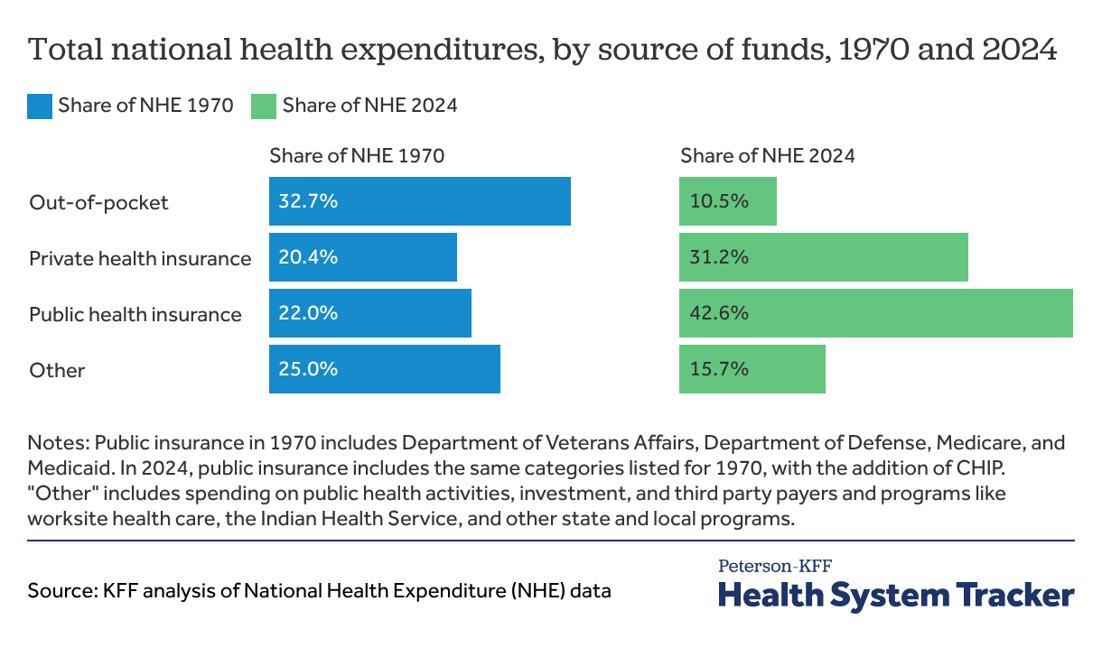 Private insurance expenditures now represent 31.2% of total health spending (up from 20.4% in 1970), and public insurance (which includes Medicare, Medicaid, CHIP, and the Veterans Administration and Department of Defense), represented 42.6% of overall health spending in 2023 (up from 22.0% in 1970). Although out-of-pocket costs per capita have increased in recent years, compared to previous decades, they now make up a smaller share of total health expenditures.
