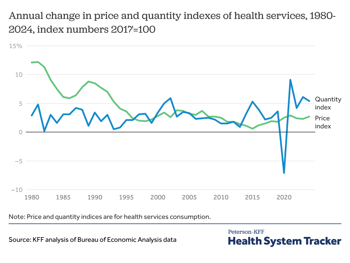 Health services spending is generally a function of prices (e.g., the dollar amount charged for a hospital stay) and utilization (e.g., the number of hospital stays). In 2024, healthcare prices increased by 2.7%, a slight uptick from 2.3% in 2023, but in line with recent years, while health services use increased by 5.4%, a drop from 6.1% in 2023 but still higher than typical pre-pandemic utilization increase levels.