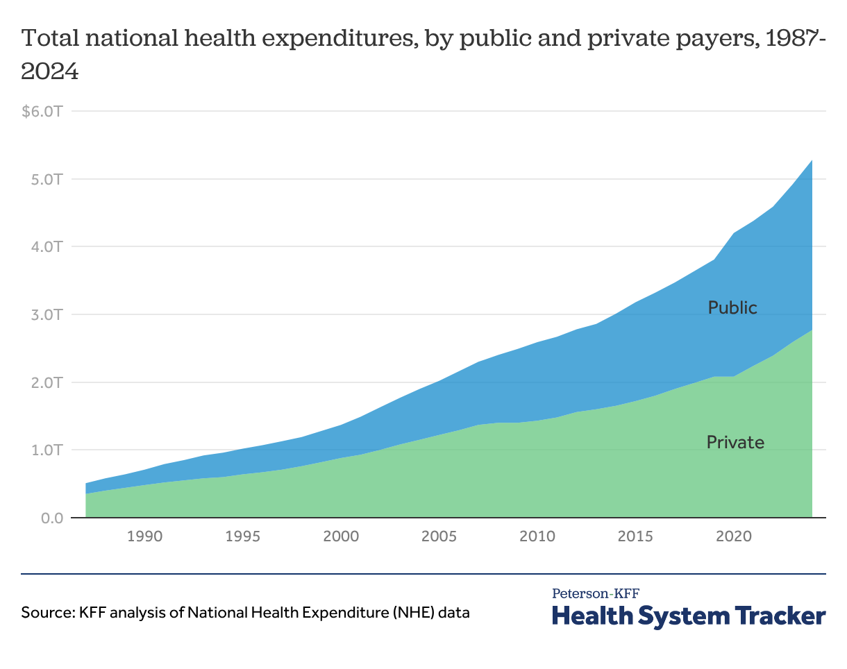 This chart collection explores National Health Expenditure (NHE) data from the Centers for Medicare and Medicaid Services (CMS). These data offer insights into changes in health spending over time in the U.S., as well as the driving forces behind spending growth. The data specifically show how healthcare spending changed in 2024. A related contains more of the latest NHE data, and a companion chart collection compares U.S. spending to peer countries.
