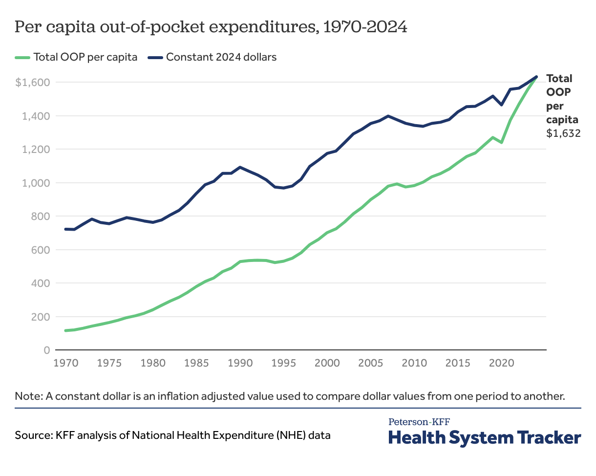 Out-of-pocket expenditures increased in 2024, averaging $1,632 per capita (out-of-pocket medical costs do not include the amount individuals contribute toward health insurance premiums). In 2024, real out-of-pocket spending also increased from the previous year from $1,596 to $1,632.