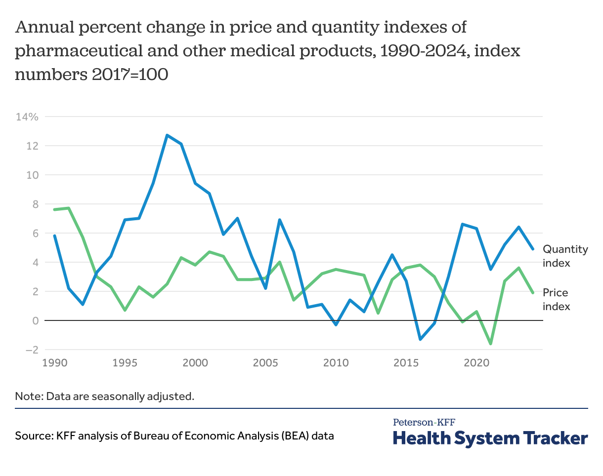 Due to the way drugs are selected for inclusion in the price index, it can take some time for new drugs to be reflected in the data. The price index for drugs grew steadily from the mid-1990s (ranging in growth from about 1% to 5% annually) before briefly declining around 2020. It increased by 1.9% between 2023 and 2024.