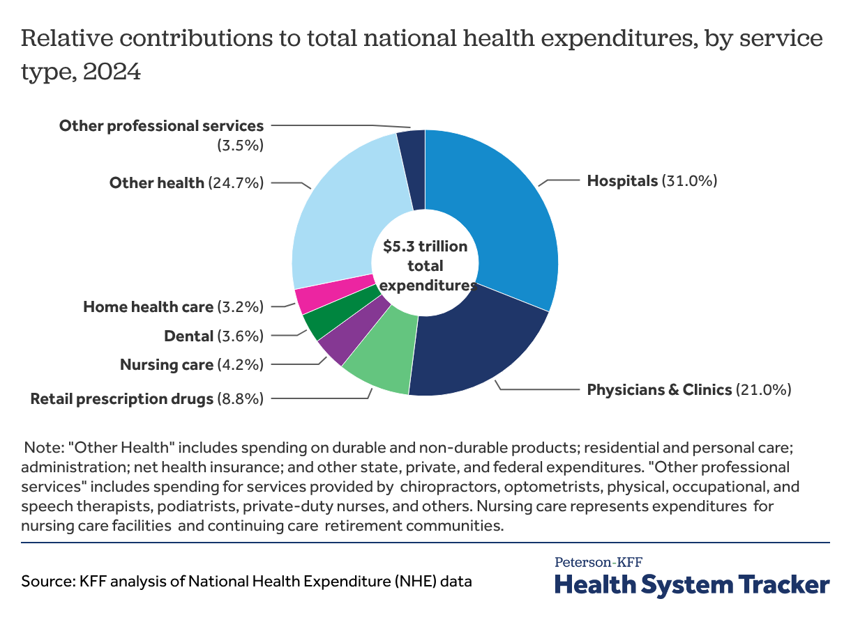 Hospital spending represented close to a third (31.0%) of overall health spending in 2024, and physicians/clinics represented 21.0% of total spending. Prescription drugs accounted for 8.8% of total health spending in 2024. These percentages stay relatively constant year-to-year.