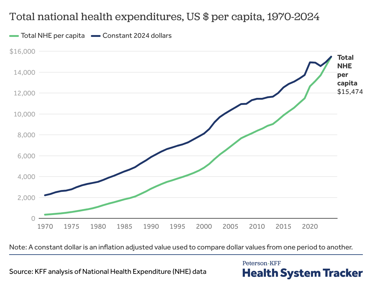 On a per capita basis, total health spending, including government, private, out-of-pocket, research, and infrastructure spending, has increased in the last five decades from $353 per year in 1970 to $15,474 per year in 2024. In constant 2024 dollars, the increase was from $2,208 in 1970 to $15,474 in 2024.