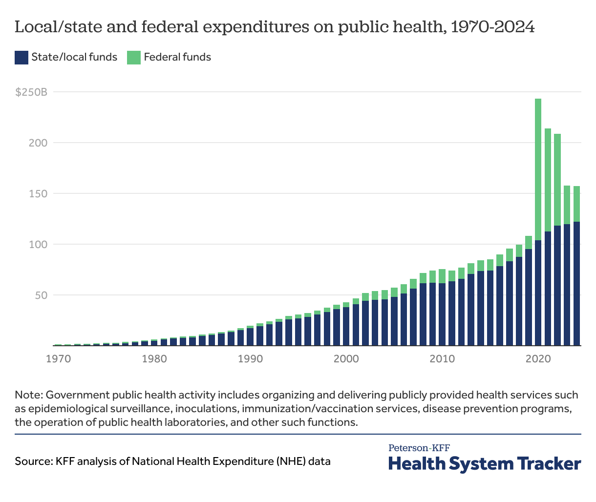 Public and private health spending have both continued to grow in the past few decades. Public spending in 2024 represented just under one-half (48%) of overall spending after briefly exceeding private spending in the first year of the pandemic. Public sector spending includes spending on insurance programs, such as Medicare and Medicaid, as well as other government spending, such as spending on public health and research.