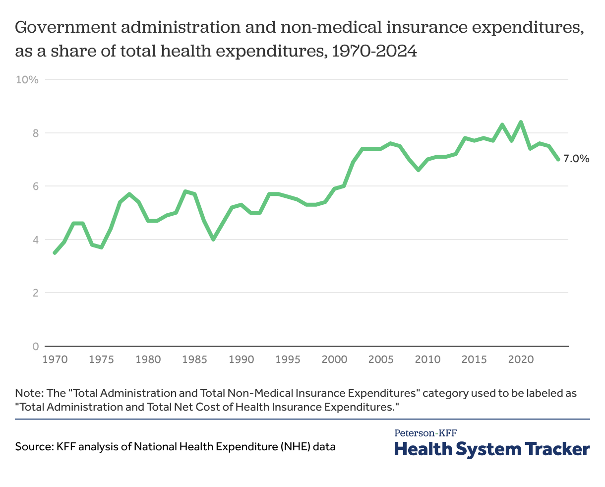 In 2024, administrative expenses – which include the cost of administering private insurance plans and public coverage programs but not the administrative costs of health providers – represented 7.0% of total national health expenditures, a decrease from 7.5% in 2023 and down from a peak of 8.4% in 2020.