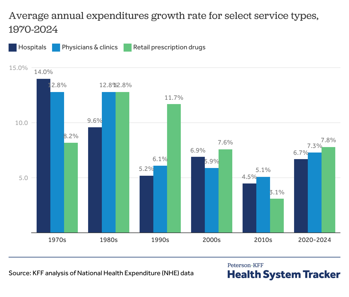 During the 1970s, growth in hospital expenditures outpaced other services, while prescriptions and physicians/clinics saw faster spending growth during the 1980s and 1990s. From 2020 to 2024, retail prescription drugs experienced the fastest average growth in spending at 7.8%, following 3.1% compound annual growth from 2010 to 2020. Average spending growth for hospitals and physicians/clinics between 2020 and 2024 was 6.7% and 7.3%, respectively.