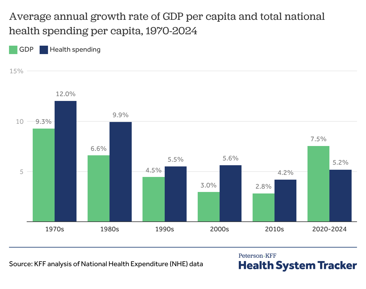 Health spending growth slowed in recent decades but consistently exceeded GDP until the 2020s